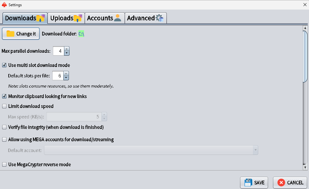 - Vamos adicionar a conta Mega ao programa indo em Edit > Settings e vai deve abrir essa interface: