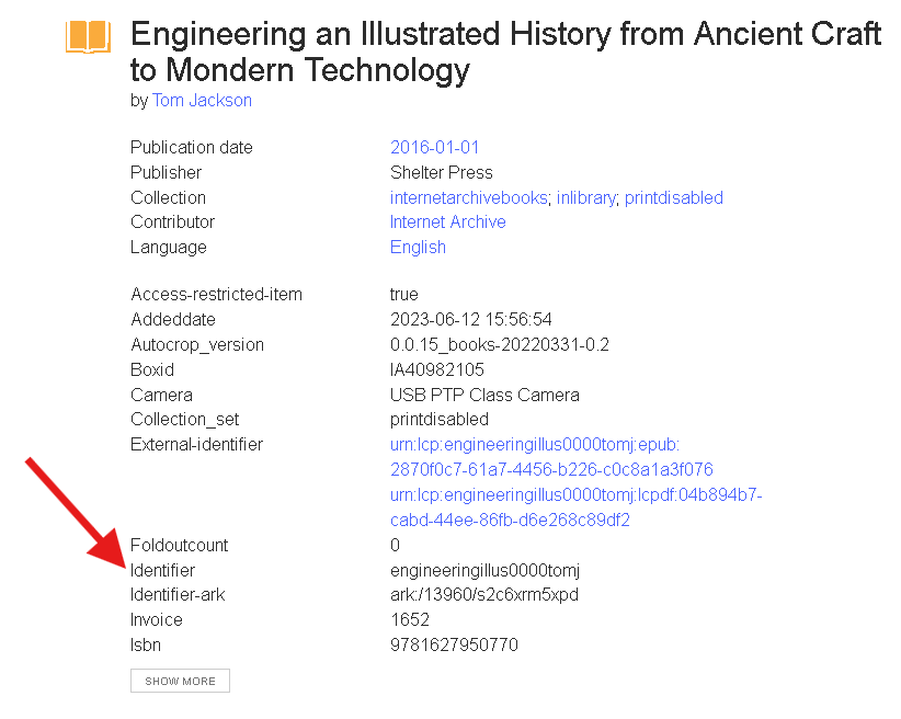 Irei usar a url do livro de exemplo: https://archive.org/details/engineeringillus0000tomj, precisaremos do identificador do livro e existem duas formas de pegar ele.